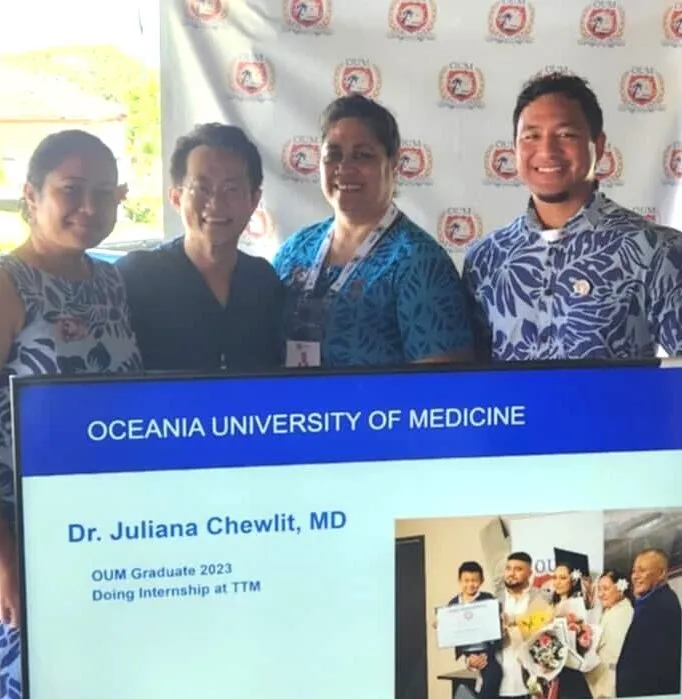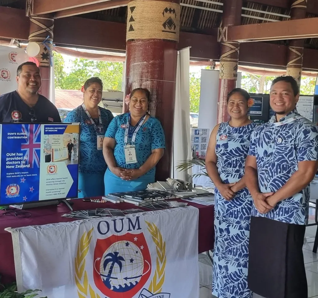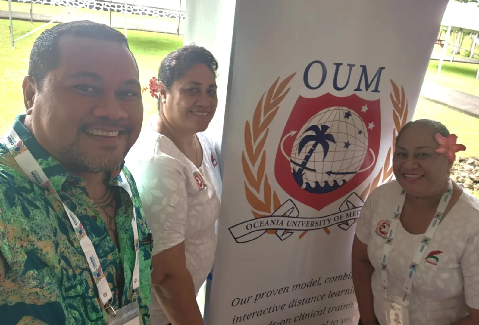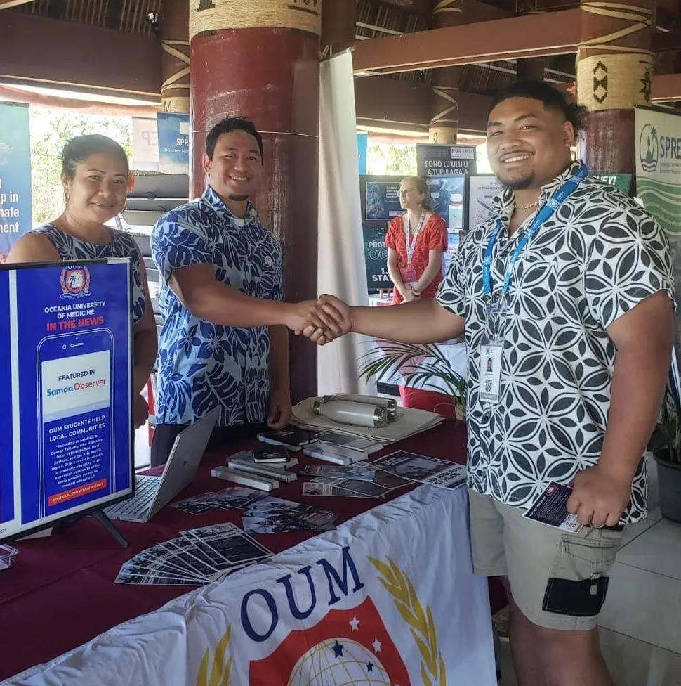 OUM was invited by National University of Samoa (NUS) to set up a booth at the Pacific & Commonwealth Universities Info Expo & Networking Side Event of CHOGM, which NUS hosted in partnership with The Association of Commonwealth Universities. Students, faculty, and staff worked at the booth, meeting with attendees and discussing our MD Program throughout the two-day event. First row of photos, from left are: #1 Dr. George Tuitama, OUM Dean for Samoa, American Samoa, Aotearoa New Zealand, and the Asia Pacific, OUM Staff Veronika Wong and Maretta Reti Ah Fook, and students Cecilia Amosa and Torren Lameko. #2 Cecilia and Torren welcoming a booth visitor. #3 Cecilia, student Frank Wong, Veronika, and Torren.