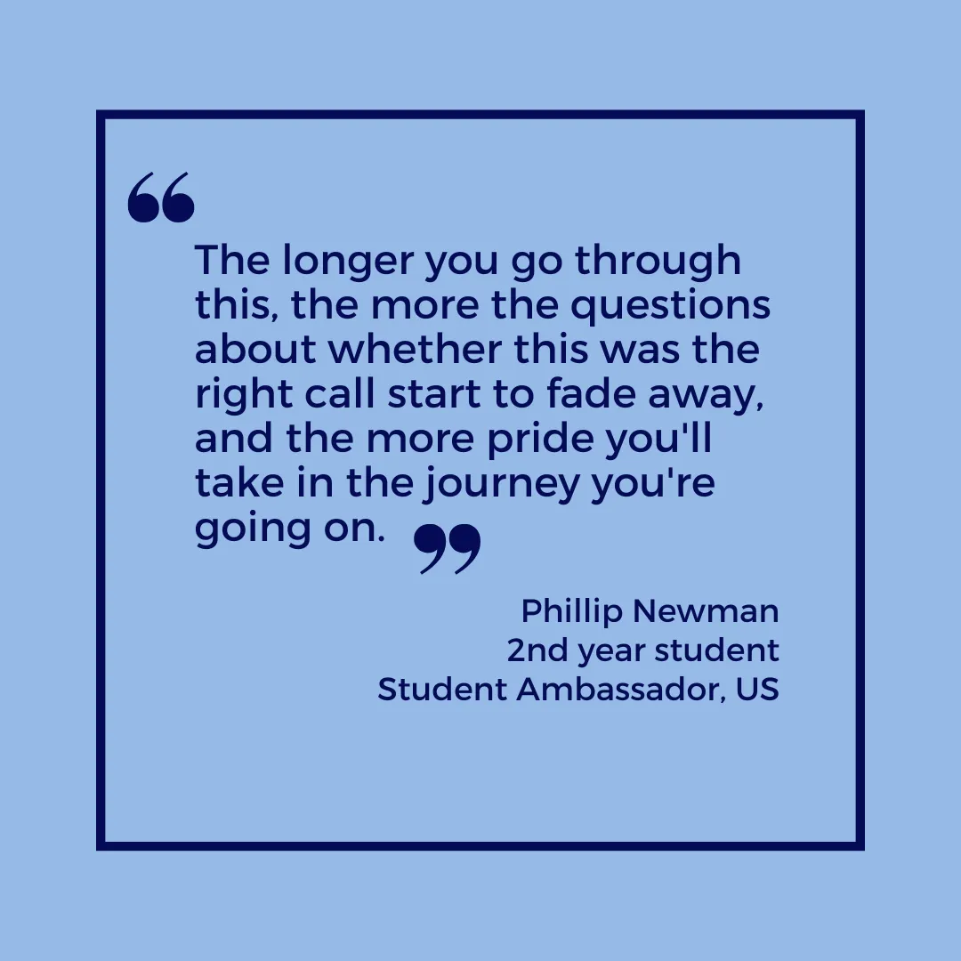 Second-year student and Student Ambassador Phillip Newman from the US reminded members of the new class to set aside time to take a break.