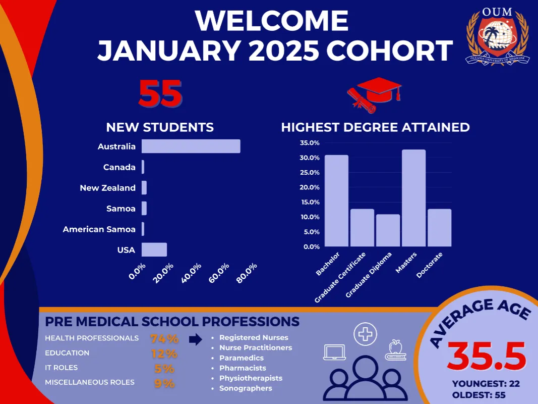 OUM welcomed an impressive group of new students during January’s Orientation Week or O Week. This is OUM’s largest cohort to date. Have a look at these newest members of OUM’s student body and the pre-medical school experience they bring to the University.