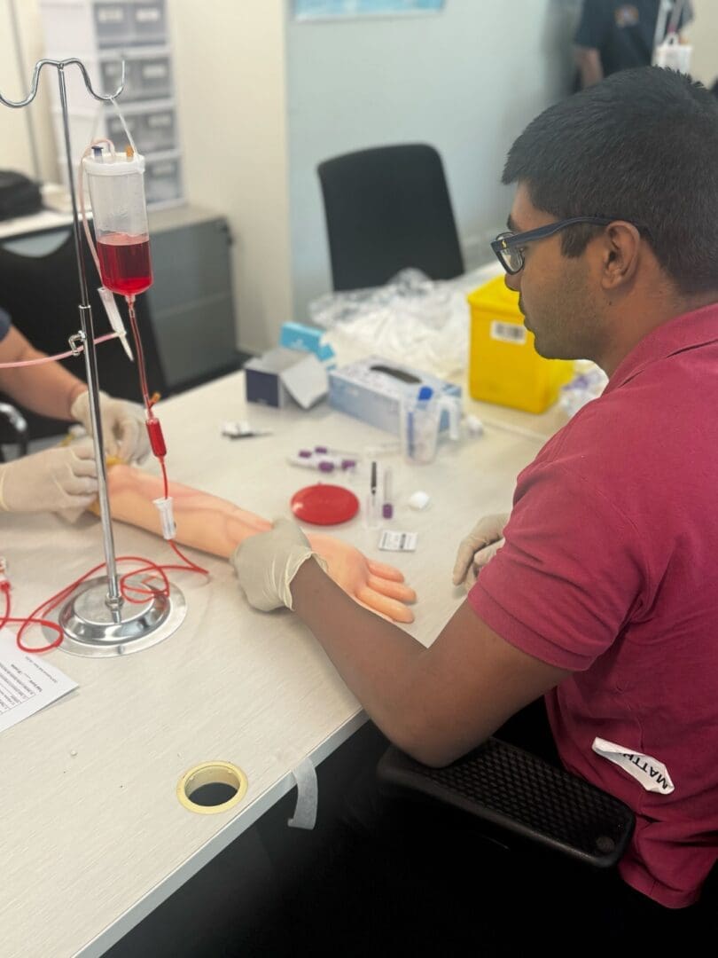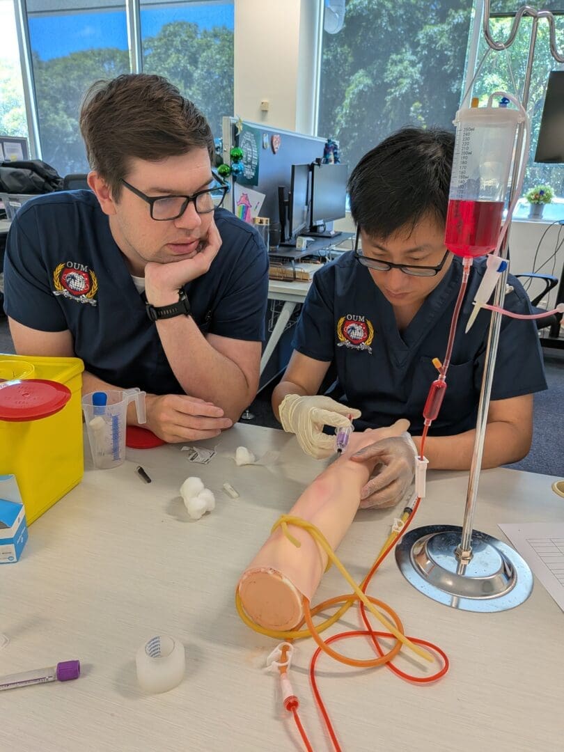OUM’s CTUs are a revamping of the University’s previous Clinical Skills Course with additional hands-on training integrated into the coursework. During in-person week, students are taught to perfect patient histories, how to gown and glove, suture, administer intradermal injections, perform cannulation (which allows for drawing blood or administering fluids/medications), and more. CTUs ensure that students are prepared to participate in all aspects of patient care, including communication with families, airway management, EKG interpretation, and other essential skills/procedures.
